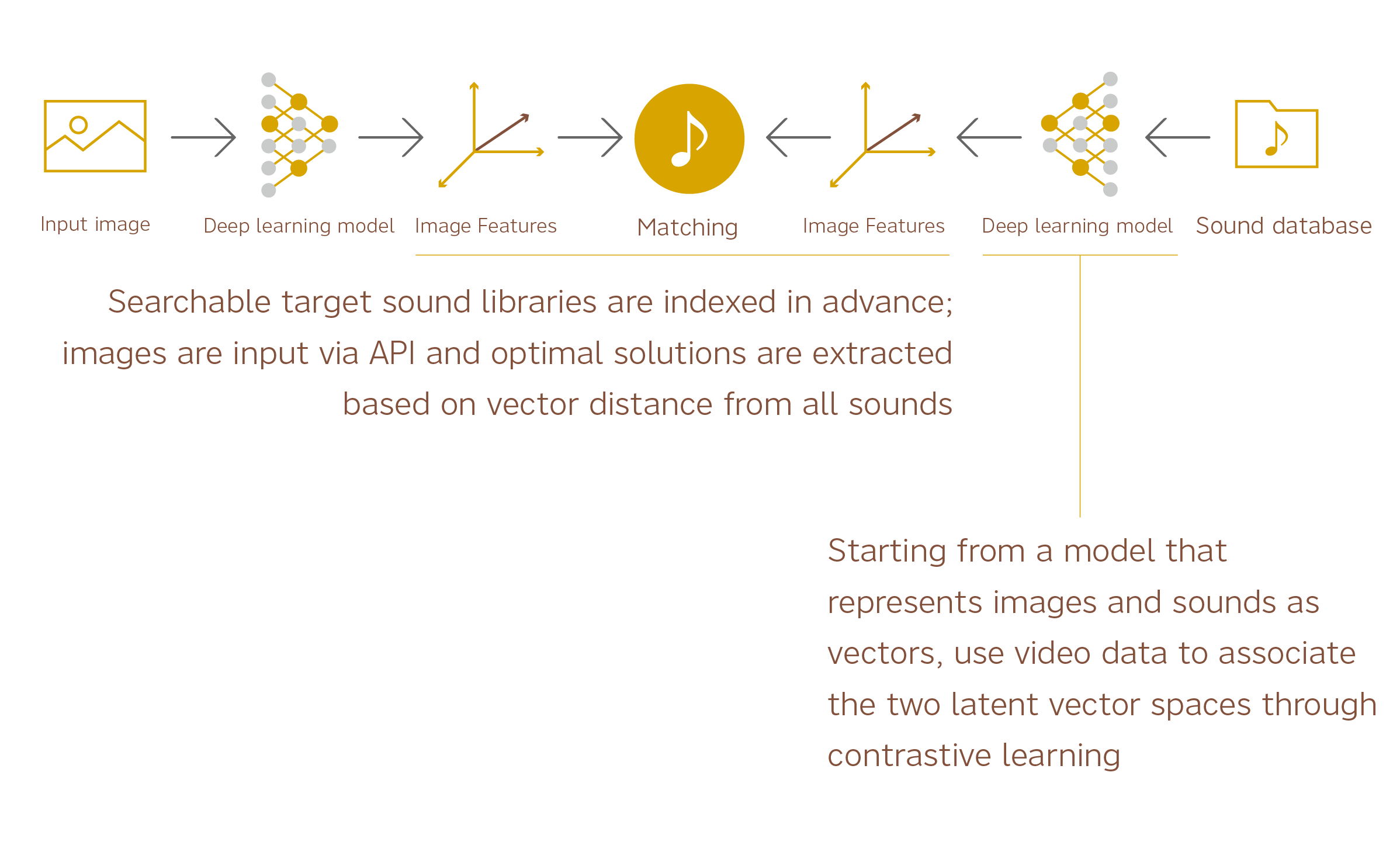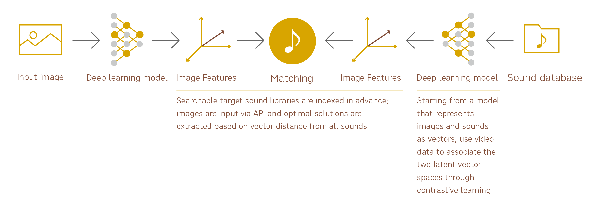 The system successfully achieved high accuracy by applying deep learning based on convolutional neural networks to select the most appropriate sound clip (environmental sound) for a given image. Since last year, we have further improved the accuracy of this system and expanded the selection target to include not only environmental sounds but also musical compositions, and as a result, we are now able to provide an algorithm that can more accurately match a wider variety of sounds. One factor in the development of this technology is the application of the CLIP model released by OpenAI last year. This model, which has been trained on a very wide range of data, enables accurate interpretation of a wide range of images and sounds in a broader context.